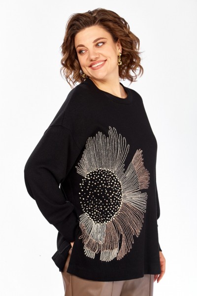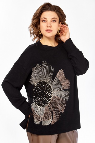 Джемпер женский из трикотажного полотна черного цвета. Модель свободного кроя с круглым вырезом горловины и цельнокроенной спинкой. Особенностью данной модели является наличие элегантной вышивки на передней части. Рукава длинные, спущеные, с аккуратными манжетами на нижнем крае. В боковых швах выполнены небольшие разрезы для большего комфорта. Изделие представлено в нескольких размерах: 52 - ПОГ 62 см, ПОБ 60 см; 54 - ПОГ 64 см, ПОБ 62 см; 56 - ПОГ 66 см, ПОБ 64 см; 58 - ПОГ 68 см, ПОБ 66 см. Длина джемпера по спинке составляет 69 см, длина от плеча до нижнего края рукава — 73 см. Обратите внимание, что фактический цвет изделия может незначительно отличаться от цвета, представленного на экране.