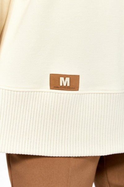 Джемпер женский, свободного кроя, изготовлен путем комбинирования трикотажного полотна. Горловина круглой формы. Рукава — реглан. В боковых швах обработаны разрезы внизу. Горловина, низ изделия и низ рукавов изготовлены из отделочного трикотажного полотна. Отделка нашивка по переду.
