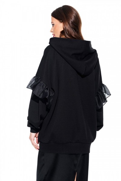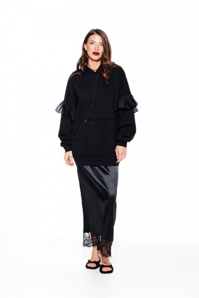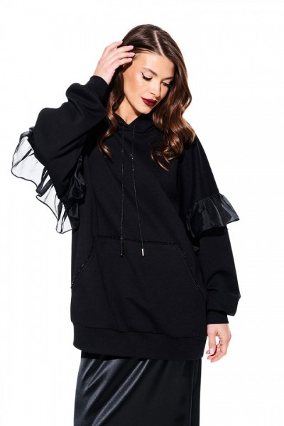 Толстовка из трикотажного полотна, свободного объема, прямого силуэта, с капюшоном. По переду выполнен накладной карман. Край кармана обработан декоративной тесьмой. Спинка цельная. Рукав втачной, длинный. Окат рукава оформлен воланом из органзы. По низу изделия и рукава притачные манжеты. Капюшон на обтачке и подкладке из органзы, через обметанные петли в кулиску продет декоративный нефункциональный шнур с металлическими наконечниками.