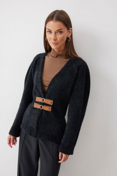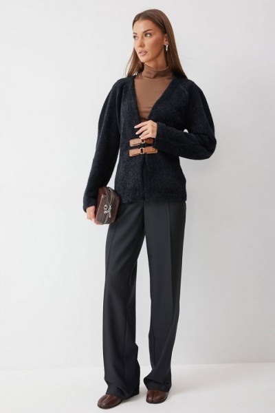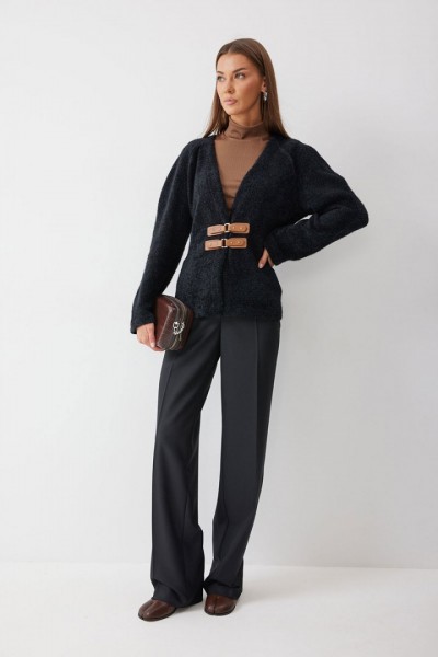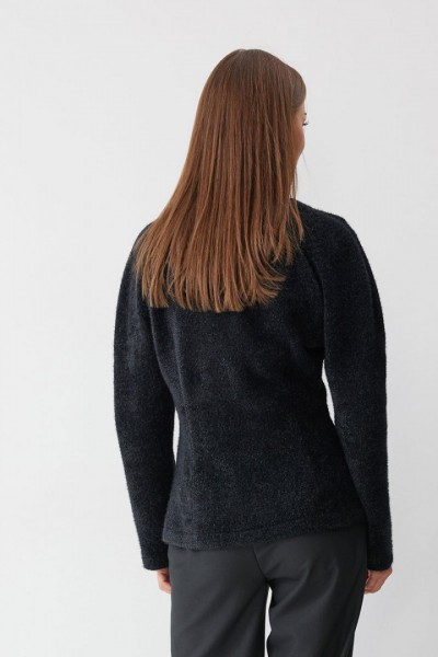 Джемпер полуприлегающего силуэта из трикотажного пушистого полотна. V-образная горловина, рукав реглан. По переду джемпера расположены пряжки. На спинке расположены вытачки, для придания силуэта.