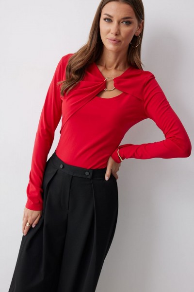 Джемпер прилегающего силуэта из трикотажного полотна. Горловина с фигурным вырезом декоративными складками и фурнитурой. Рукав втачной удлиненный . Обращаем ваше внимание, что фурнитура может отличаться от фото.