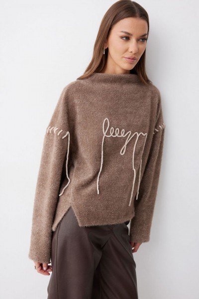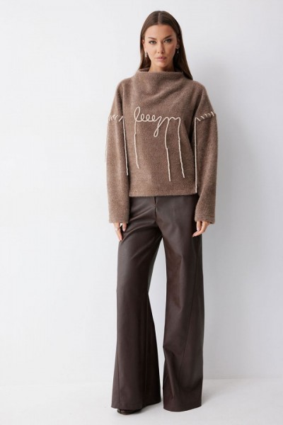 Джемпер прямого силуэта из трикотажного полотна с фигурным низом. Горловина цельнокроеная стойка. Рукав со спущенной линией плеча, удлиненный. Джемпер со смещенным боковым швом. По переду джемпера дизайнерская вышивка.
