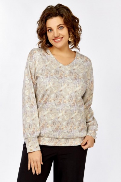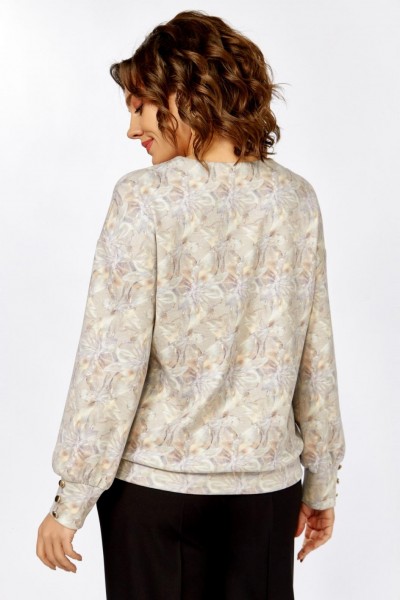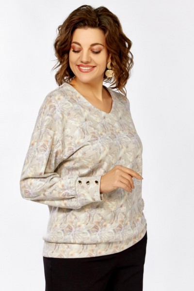 Джемпер из мягкого вискозного трикотажного полотна свободного силуэта со спущенной линией плеча. Горловина мягкой V-образной формы, рукав длинный, по низу присобран на манжеты из основной ткани, которые украшены тремя декоративными пуговицами. Низ джемпера оформлен притачной планкой из основной ткани.