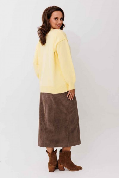 Джемпер свободного силуэта. Горловина круглая, рукава спущенные, плечевые швы специально вывернуты на лицо изделия. Ткань мягкая, плотная, хорошшо держит форму.рукава и низ изделия на свободной вязанной резинке. По низу изделия декоративная нашивка.