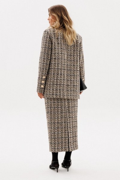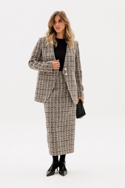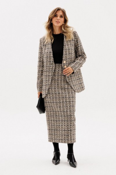 Юбка выполнена из твида. Юбка заужена к низу, длиной миди. Юбка на притачном поясе. Сзади в среднем шве разрез и застежка на потайную молнию и пуговицу. Юбка на отлетной по низу подкладке.