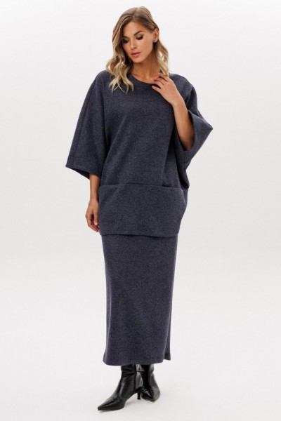Юбка выполнена из трикотажного полотна. Юбка прямого силуэта, длиной миди, на цельнокроенном поясе с эластичной тесьмой. Сзади разрез в среднем шве.