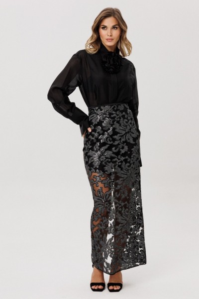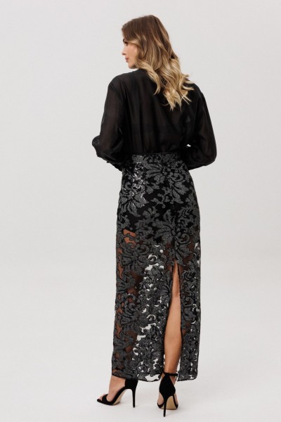 Юбка выполнена из сетки с вышивкой с пайетками. Юбка прямого силуэта, длиной миди. Юбка на притачном поясе, застегивающимя на петлю и пуговицу и на потайную молнию сзади в среднем шве. Юбка без подкладки.