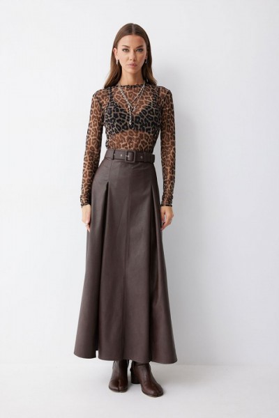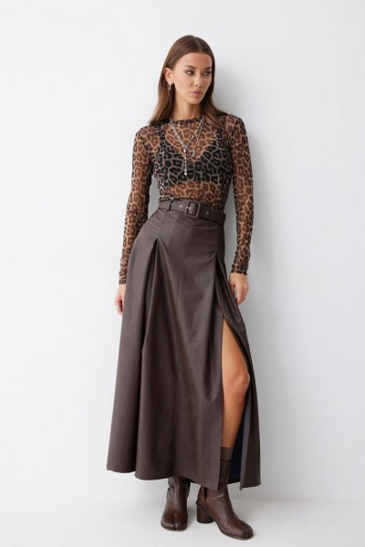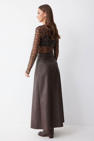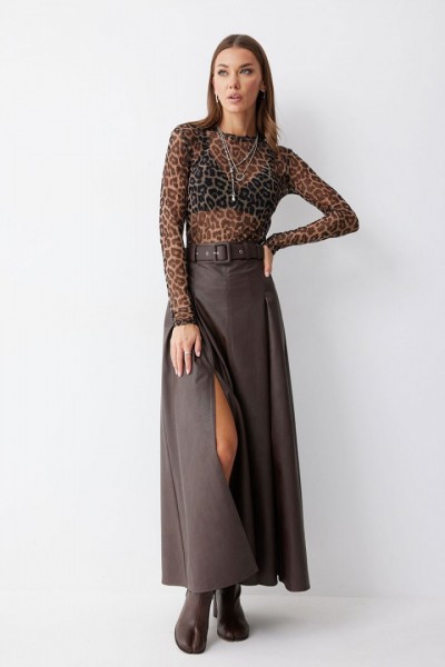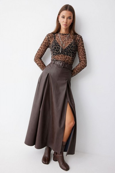 Стильная юбка А-силуэта из экокожи , длины макси. По верху юбки притачной пояс с шлевками для ремня. На передних половинках расположены вытачки со встречной складкой и разрезами по низу. На задних половинках расположены талиевые вытачки. На спинке по центру потайная молния. В комплект входит ремень.