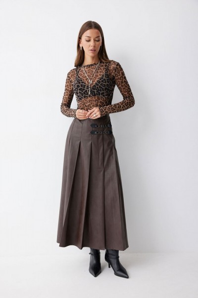 Юбка А-силуэта из экокожи на хлопковой основе. По верху юбки притачной пояс со шлевками для ремня. Переднее полотнище юбки со складками и шлицей и декоративной фурнитурой. На задних половинках расположены талиевые вытачки. На спинке в центральном шве потайная молния. По бокам в поясе вставлена резинка от складки до вытачки.