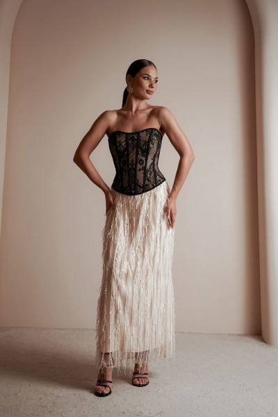 Юбка женская из костюмно-плательной ткани в пайетки, юбка прямого силуэта, длина макси, юбка на подкладке без боковых швов. Верх юбки с небольшой сборкой, пояс притачной, частично на резинке, застежка на потайную молнию и разрез по среднему шву сзади.