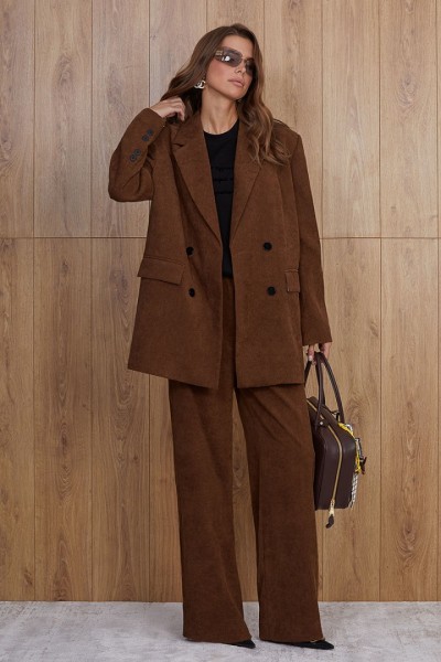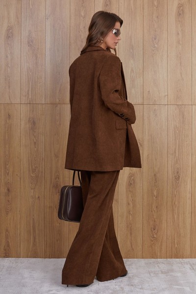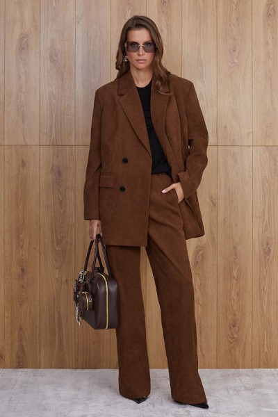 Жакет прямого силуэта, выполнен из вельвета на авторской вискозной подкладке. Жакет прямой, выполнен по типу “мужской пиджак”. Немного удлиненное плечо. Изделие с двубортной застежкой на 4 петли и пуговицы. Воротник пиджачного типа. На полочках нагрудные вытачки, прорезные карманы в рамку и клапаны. Борта прямые. Спинка прямая. Рукав втачной двух шовный. Низ рукава со шлицей и декоративными пуговицами.