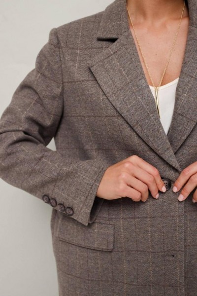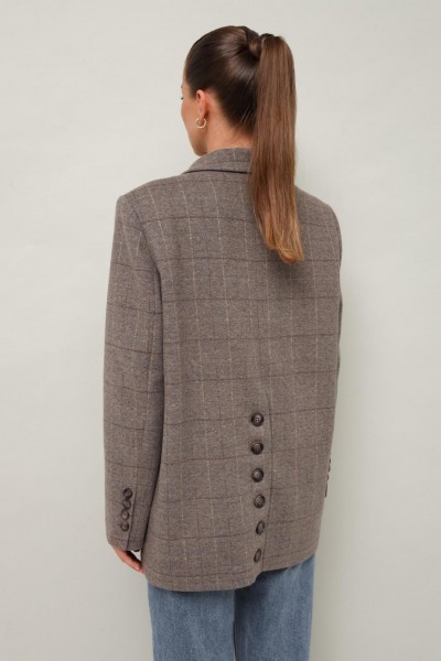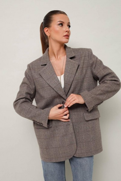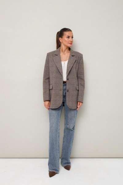 Жакет актуального прямого кроя, выполнен из костюмной ткани. Воротник пиджачного типа с отложными лацканами, край борта скругленный по низу жакета. Спереди обработаны прорезные карманы в рамку с клапанами. Рукава втачные двухшовные со шлицей и пуговицами. Спинка со средним швом, переходящим в высокую шлицу с застежкой на петли и пуговицы. Жакет на подкладке.