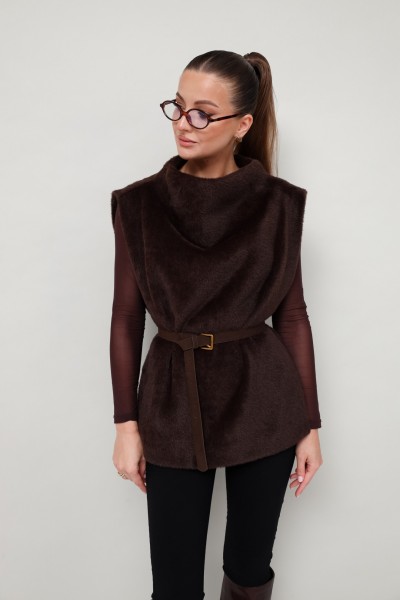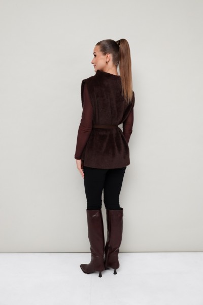 Стильный жилет прямого силуэта, выполнен из искусственного меха на подкладке. Цельнокроеный воротник-стойка. Идеальный выбор для холодных дней, который сочетает в себе комфорт, тепло и актуальный дизайн.