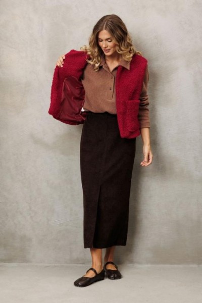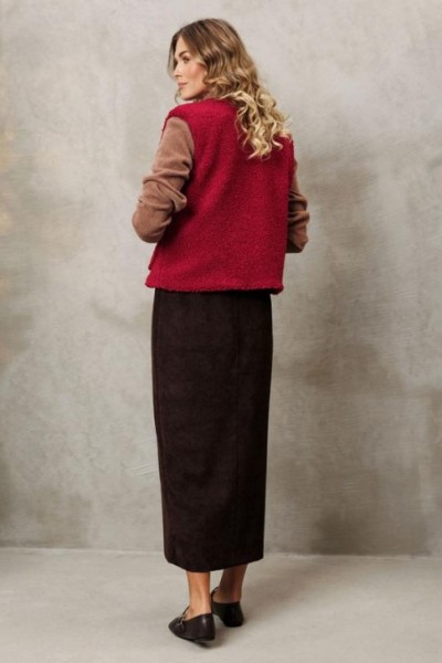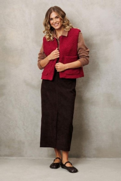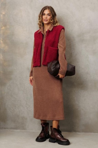 Жилет прямого свободного силуэта из теплой ткани "барашек". Перед с настрочными карманами. Застежка на 3 петли и пуговицы. Жилет на подкладке.