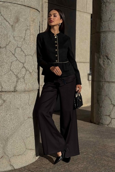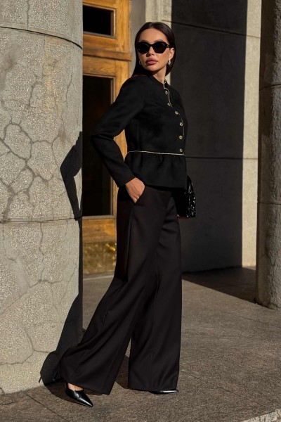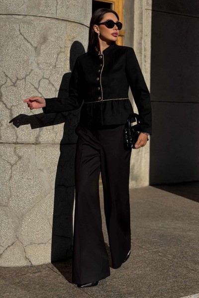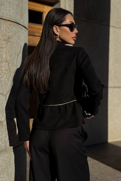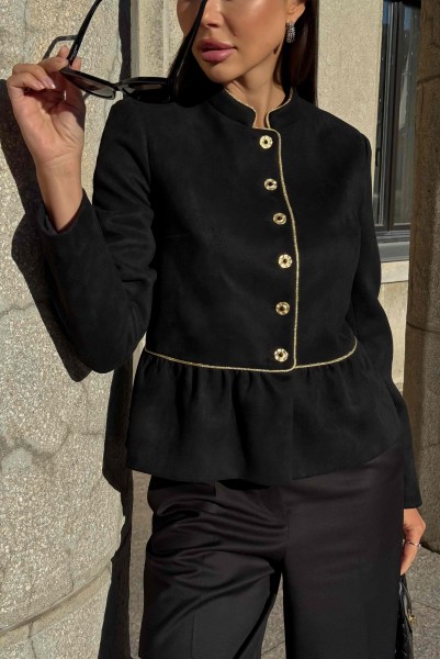 Женский чёрный замшевый жакет URS — воплощение элегантности, уверенности и изысканного вкуса. Эта модель создана для женщин, которые ценят стиль, комфорт и внимание к деталям. Жакет женский, нарядный, полуприлегающего силуэта из мягкой искусственной замши на трикотажной основе, отрезной по линии талии, с центральной бортовой застежкой от шва талии до верха на 6 петель и 6 пуговиц (размер и цвет фурнитуры может незначительно отличаться от фото).
