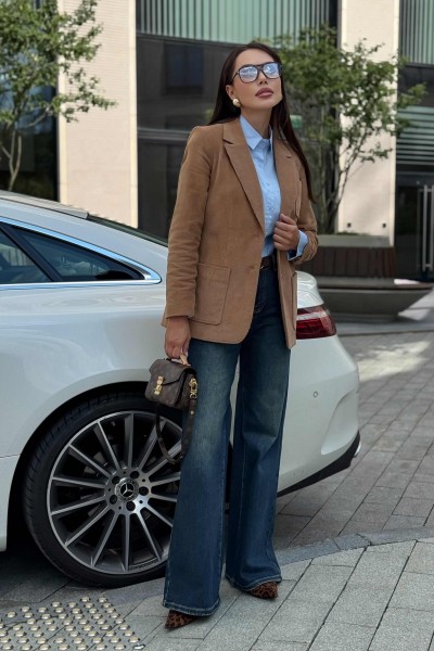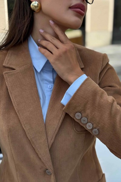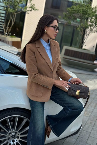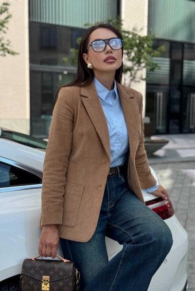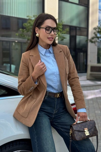 Жакет женский вельветовый коричневый URS — это сочетание элегантного стиля и практичности. Классический приталенный крой, лацканы и застёжка на пуговицы делают его универсальным вариантом для офиса, прогулок и городских встреч. Жакет женский полуприлегающего силуэта, выполнен из костюмной вельветовой ткани, на подкладке, с воротником пиджачного типа, предназначен для повседневной носки. Перед жакета с центральной бортовой застежкой на 2 петли и 2 пуговицы (фурнитура может незначительно отличаться от фото), с закругленными по низу бортами. Перед с полурельефами и с вертикальными рельефными швами. Нижние части переда и верхняя левая часть переда с накладными карманами закругленной формы. Спинка с рельефными швами, со средним швом в нижней части со шлицей.