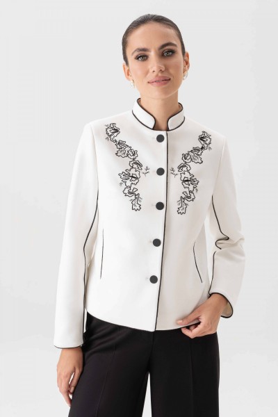 Жакет с центральной бортовой застежкой на 5 петель и пуговиц (фурнитура может незначительно отличаться от фото). По верху жакета выполнена вышивка. Перед с нагрудными вытачками, выходящими из бокового шва и вертикальными карманами с листочкой с отделкой кантом.