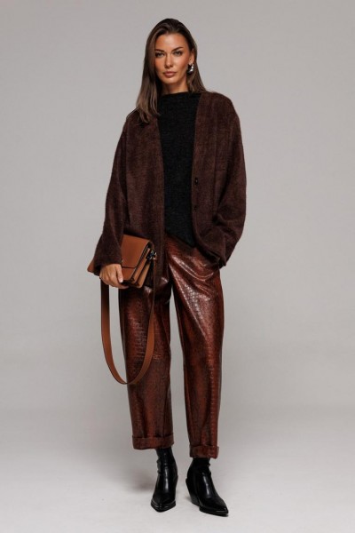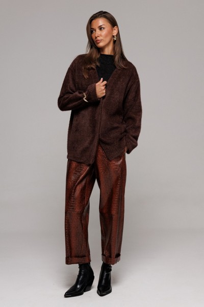Элегантный кардиган коричневого цвета выполнен из мягкого трикотажного полотна, создавая уютное настроение. Дизайн свободного силуэта, слегка сужается к низу, обеспечивая комфортное облегание. Спущенная линия плеч и втачные рукава добавляют современный акцент в стиль одежды. Воротник с V-образным вырезом и центральная застежка на пришивные кнопки придают изящество модели, подчеркивая безупречный вкус. Идеален для создания стильного повседневного образа.