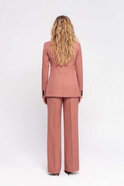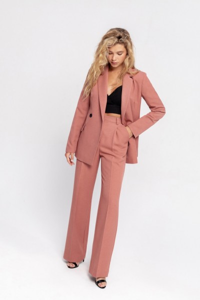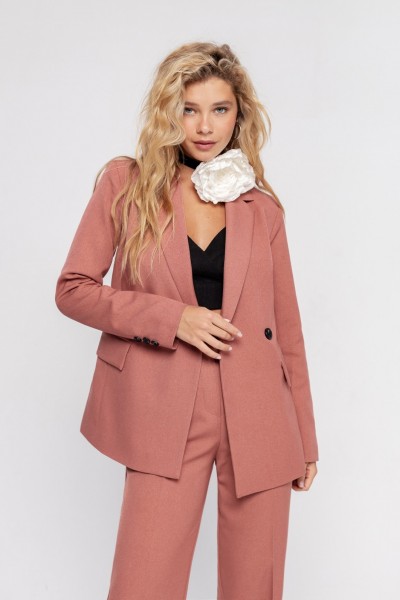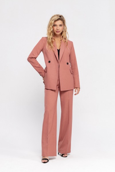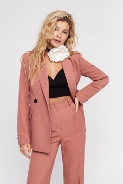 Детали: жакет с отрезными бочками и нагрудными вытачками, пиджачный воротник, прорезные карманы, двубортная застежка на петли и пуговицы, спинка со средним швом, втачные двухшовные рукава, жакет на подкладке.