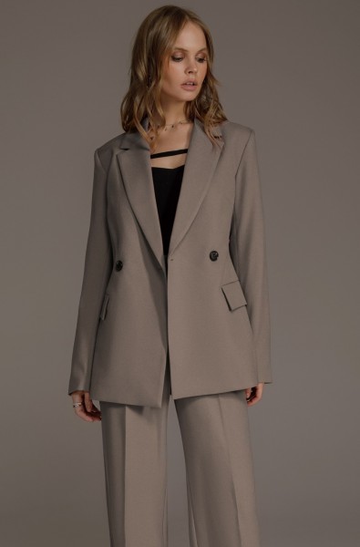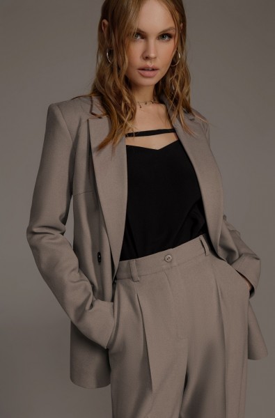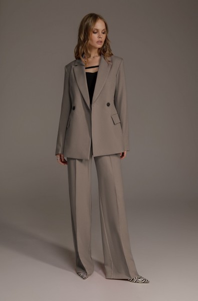 Детали: жакет с отрезными бочками и нагрудными вытачками, пиджачный воротник, прорезные карманы, двубортная застежка на петли и пуговицы, спинка со средним швом, втачные двухшовные рукава, жакет на подкладке.