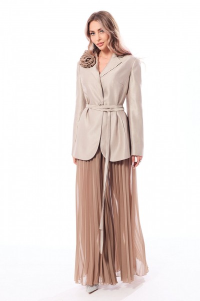 Жакет с центральной застежкой на петли и пуговицы, втачным воротником и лацканом пиджачного типа. По переду с рельефами, выходящими из проймы и нагрудными вытачками. В рельефных швах расположены карманы. По спинке с рельефами, выходящими из проймы. Жакет со съемной брошью. Рукав втачной, длинный. Брюки- гофре расширенного силуэта, с отрезным поясом, без застежки, верх брюк присборен на резинку. Брюки без боковых швов.