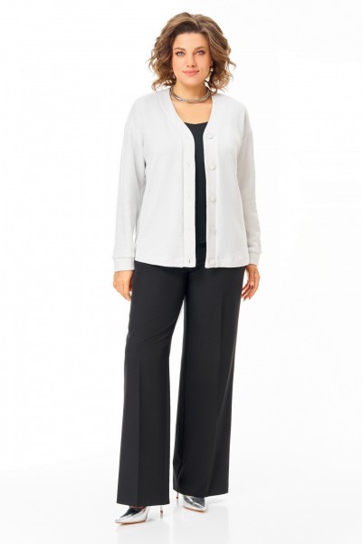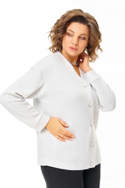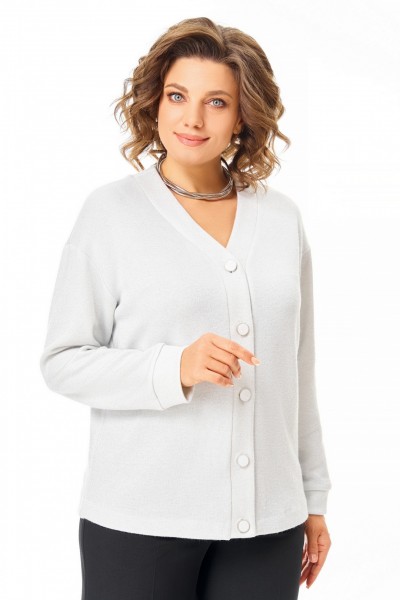 Кардиган из мягкого вискозного трикотажного полотна с серебристой люрексовой нитью, прямого силуэта со спущенной линией плеча и центральной застёжкой на петли и декоративные пуговицы. Горловина и борта обработаны фигурной планкой из основной ткани. Вырез горловины V-образной формы, рукав длинный, по низу с манжетой из основной ткани.