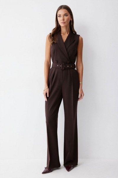 Комбинезон полуприлегающего силуэта из костюмной ткани. Воротник пиджачного типа. Комбинезон отрезной по линии талии, верхняя часть комбинезона на запах. На спинке в среднем шве застежка на потайную молнию. В боковых швах карманы. По переду на лифе талиевые и нагрудные вытачки, на брюках декоративные складки. На спинке лифа талиевые вытачки. В комплект входит ремень. Обращаем ваше внимание, что фурнитура может отличаться от фото.