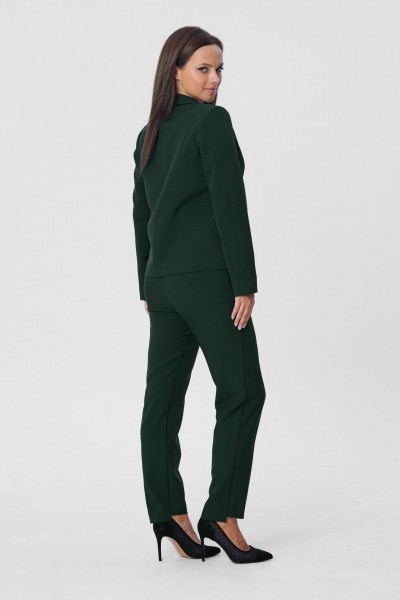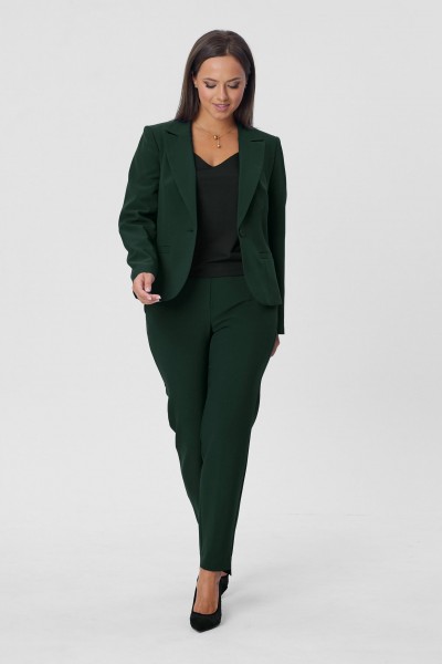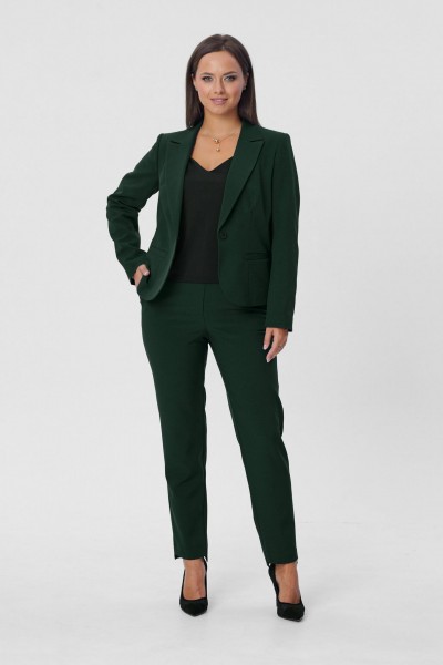 Костюм женский двухпредметный, состоящий из жакета и брюк. Жакет полуприлегающего силуэта с центральной бортовой застёжкой на одну петлю-пуговицу до линии перегиба лацкана. Перед с талиевой вытачкой и прорезным карманом с листочкой с втачными концами. Спинка со средним швом. Рукав втачной двухшовный длинный. Воротник пиджачного типа. Брюки классического кроя, слегка зауженные к низу с притачным поясом с резинкой по задним половинкам брюк. Брюки с наклонным к боковому шву карманом и двумя фигурными хлестиками на одну пуговицу по поясу передних половинок. Застёжка на тесьму - молнию и одну петлю-пуговицу по поясу. Низ брюк имеет фигурную форму - укорочена по передним половинкам и удлинённые по задним.