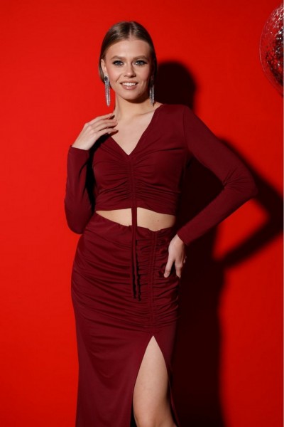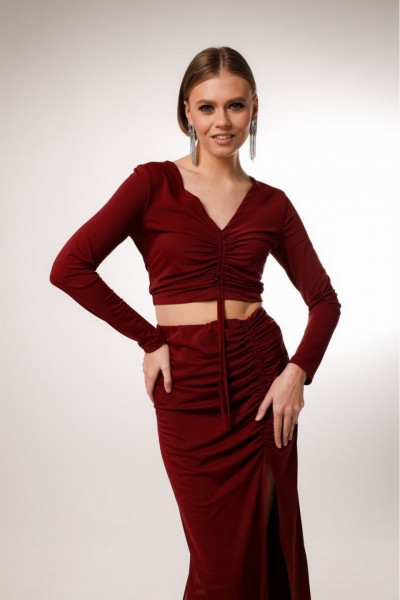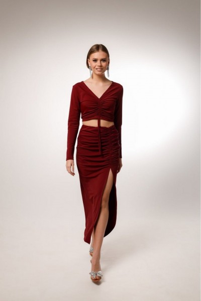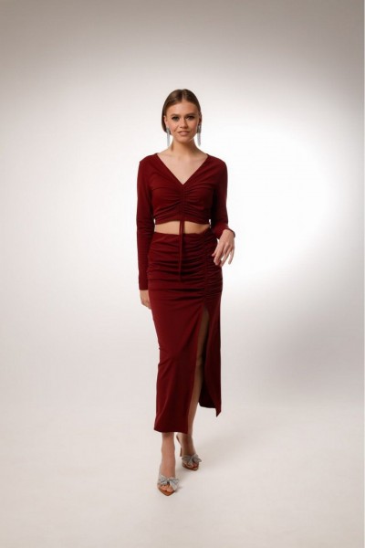 Комплект состоит из топа и юбки, выполнен из качественного бифлекса, эластичного, приятного к телу. Юбка с глубоким вырезом спереди, с кулисой, регулирующая уровнь натяжения и длина изделия. Топ также с кулисой, длину которого можно регулировать и может получиться полноценный джемпер, прикрывающий живот.