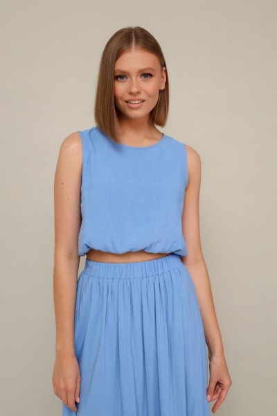 Элегантный комплект, состоящий из блузки и юбки. Округлый вырез горловины. Низ блузки собран на резинку. По спинке разрез с застежкой на пуговицу и навесную петлю. Юбка Аобразного силуэта, с притачным поясом на