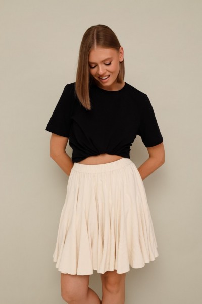короткие. Эффектная мини-юбка А-образного силуэта, за счет втачных клиньев разной высоты. Притачной пояс на резинке, со строчками.