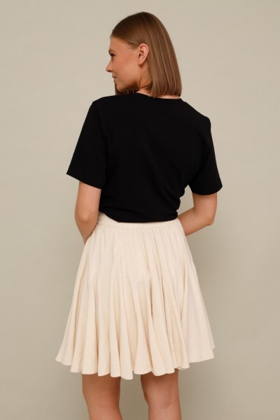 Трендовый комплект, состоящий из хлопкового джемпера и мини-юбки. Футболка прямого кроя со слегка спущенной линией втачивания плеча. Округлый вырез горловины. Рукава втачные
