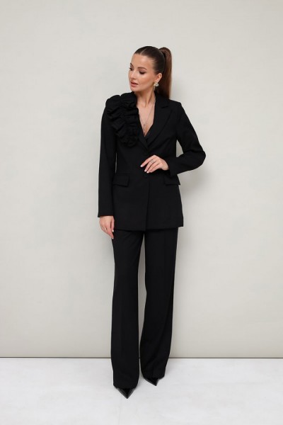 Эффектный 2-предметный комплект, состоящий из жакета и брюк, выполненный из костюмной ткани. Жакет женский полуприлегающего силуэта с центральной застежкой на петли и обтяжные пуговицы. Воротник пиджачного типа с отложными лацканами. Спереди обработаны прорезные карманы в рамку с клапанами. Рукава втачные двухшовные. Спинка со средним швом и рельефами. Изделие обработано подкладкой. Брюки прямого силуэта с заутюженными стрелками и с боковыми наклонными карманами. Пояс притачной с застежкой на пуговицу и тесьму-молнию, по спинке пояс на резинке для регуляции размера. В комплекте прилагается съемная брошь из основной ткани.