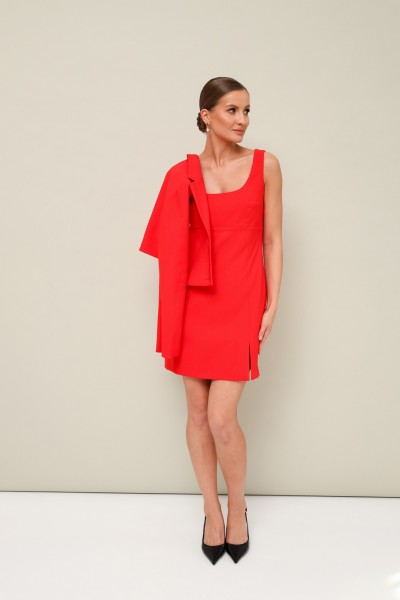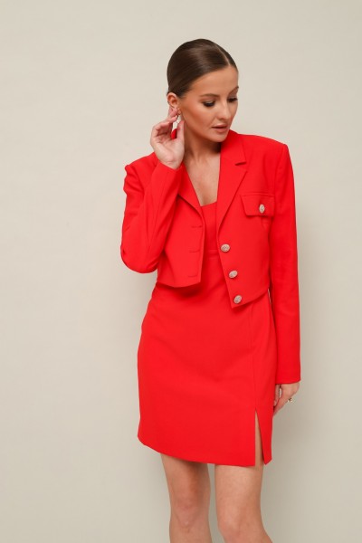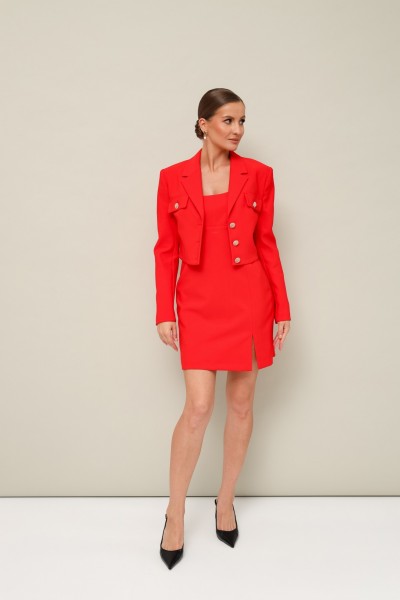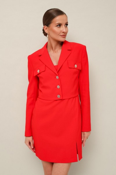 Комплект 2-предметный, состоящий из жакета и платья. Укороченный жакет полуприлегающего силуэта с центральной застежкой на петли и пуговицы. Воротник пиджачного типа с отложными лацканами. Перед жакета с накладными клапанами с пуговицами. Рукава втачные двухшовные. Спинка с талиевыми вытачками. Изделие на подкладке. Платье прилегающего силуэта в длине мини, с отрезным лифом и вытачками. Нижняя часть с вертикальным швом переходящим в разрез. Спинка отрезная с вытачками, с застежкой в среднем шве на потайную тесьму-молнию. Платье обработано хлопковой подкладкой.