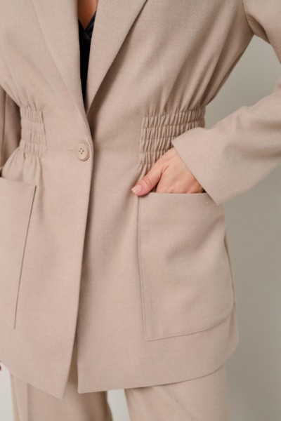 Жакет полуприлегающего силуэта, с центральной застежкой на петлю и пуговицу. Воротник пиджачного типа с отложными лацканами. По линии талии обработана широкая резинка. Спереди - накладные карманы. Рукава втачные двухшовные. Средний шов по спинке. Изделие на подкладке.