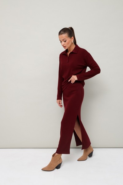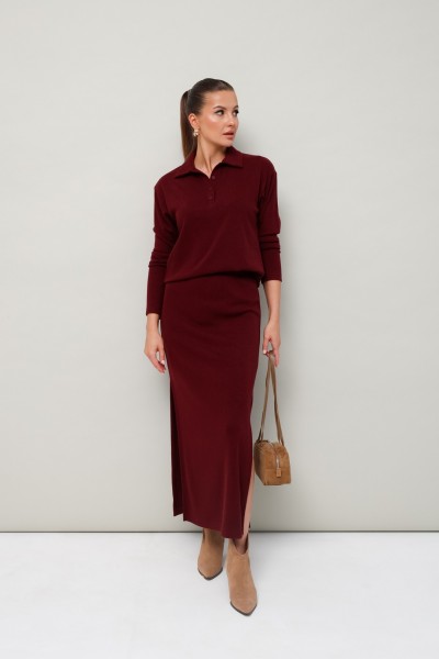 Комфортный трикотажный комплект, состоящий из поло и юбки. Поло с отложным воротником с цельнокроеной стойкой. Вырез горловины обработан притачными планками с застежкой на петли и пуговицы. Спущенная линия втачивания рукава. Юбка прямого кроя, пояс на резинке, в боковых швах обработаны высокие разрезы.