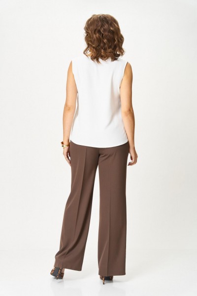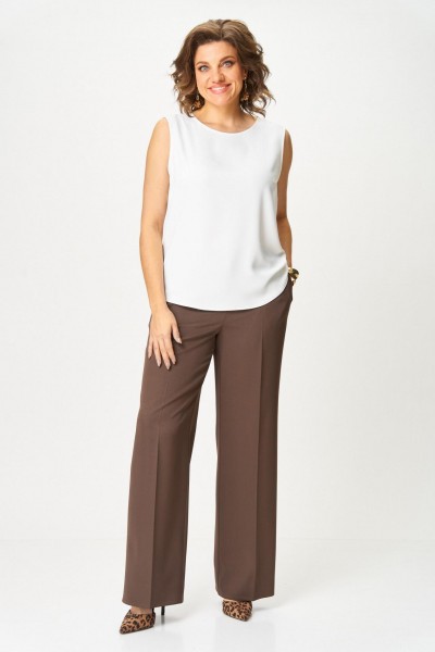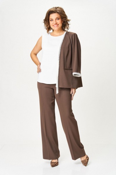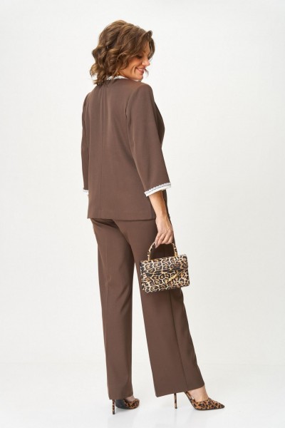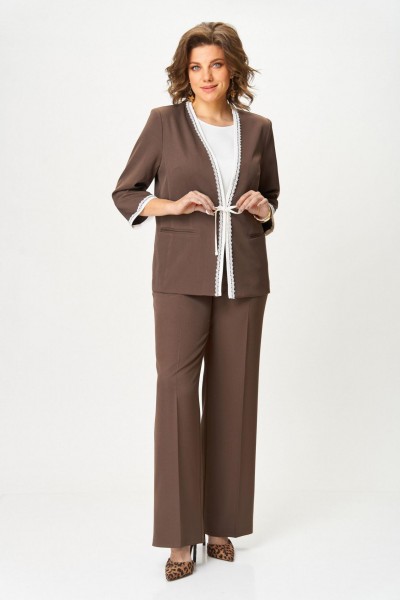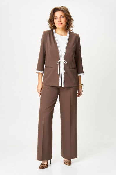 Костюм женский трехпредметный, состоящий из жакета без подкладки, брюк и блузки. Жакет полуприлегающего силуэта с застежкой встык на завязки, с отрезным бочком и талиевой вытачкой по переду. Также в изделии обработаны карманы в рамку. Спинка со средним швом. Линия борта имеет фигурную форму. Рукава втачные одношовные длиной 3/4. Низ рукавов, горловина и край борта обработаны контрастного цвета бейкой с кружевом. Блузка полуприлегающего силуэта с нагрудными вытачками, выходящими из боковых швов, с овальной линией горловины, без рукавов. Низ изделия имеет фигурную линию. Брюки классического кроя, расширенные к низу с притачным поясом, сзади на резинке, с карманами, наклонными к боковому шву, и с застежкой на тесьму -молнию в средних срезах передних половинок и 1 петлю-пуговицу по поясу. На брюках заутюжены канты.