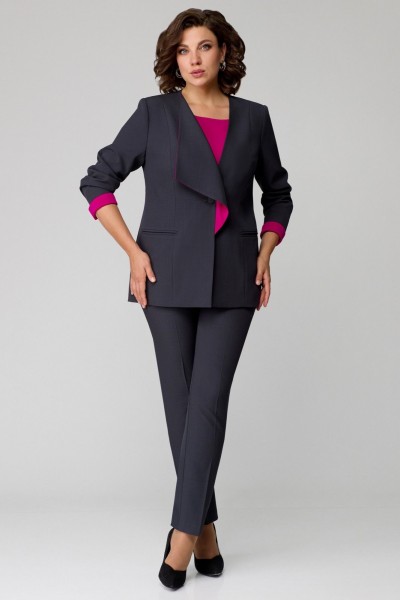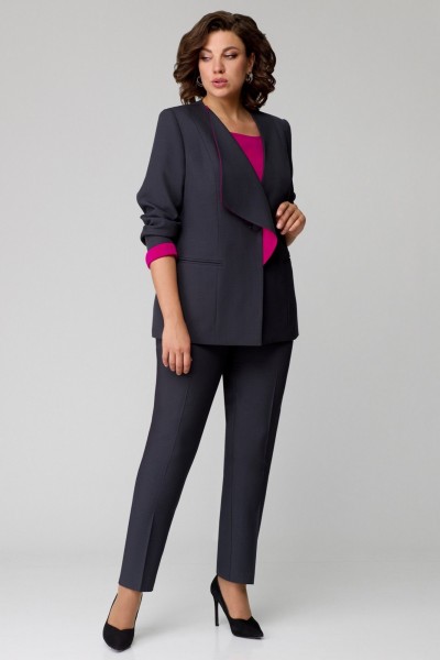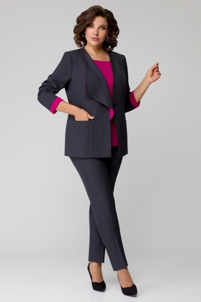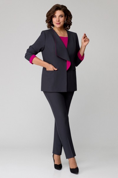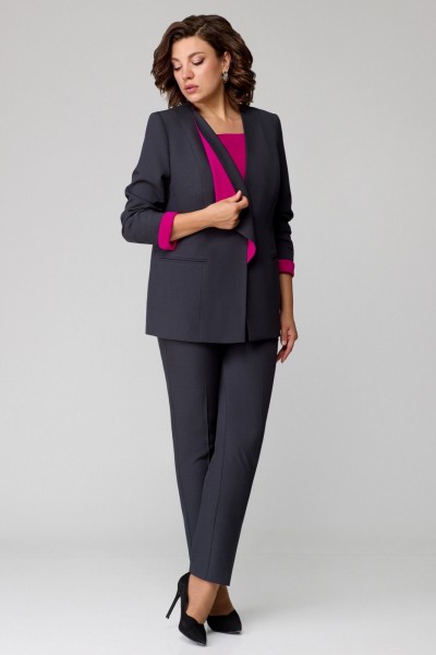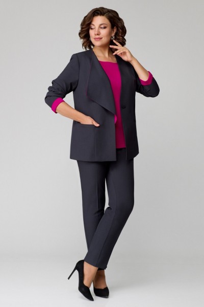 Комплект женский трехпредметный, затмит вашим образом. Жакет на подкладке с центральной застежкой на 1 петлю и пуговицу с асимметричным воротником и контрастной отделкой. По переду функциональные карманы. Спинка с рельефом выходящим из плеча и средним швом. Рукав втачной двухшовный с контрастной манжетой. Блузка с округлым вырезом горловины и спущенной линией плеча. Брюки классические средней посадки с боковыми карманами. Пояс с резинкой по бокам. Длина жакета 70 см, Длина рукава 58см. Длина брюк 102 см.