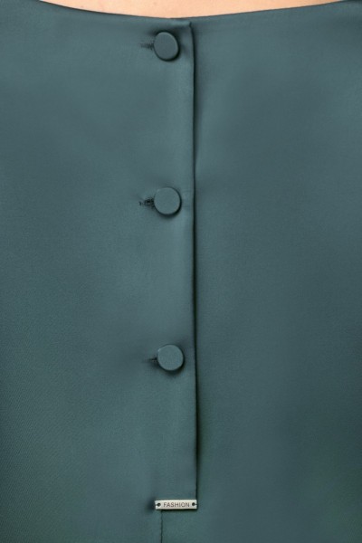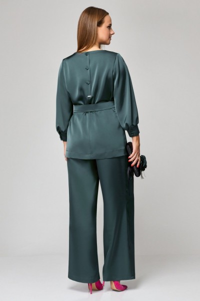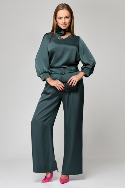Комплект женский двухпредметный. Блузка - прямого силуэта с V-образным вырезом горловины. По спинке застежка на 3-петли и пуговицы. В боковых швах разрезы. Рукав втачной со складкой по низу с манжетой. Брюки классического покроя, прямые от бедра. В боковых швах карманы с отрезными бочками. Пояс отрезной со шлевками. Застежка на молнию и петлю с пуговицей. Изделие дополнено съемным поясом из основной ткани на пряжке. Длина блузки 69 см, длина рукава 52 см, длина брюк 106 см. Украшение в комплект не входит.