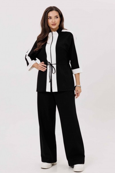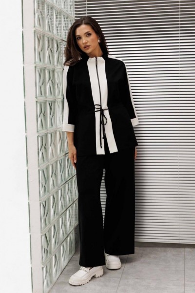 Элегантный женский костюм в черно-белой цветовой гамме, добавляющий изысканности любому гардеробу. Модель состоит из жакета прямого силуэта с оригинальной застежкой на декоративную тесьму-молнию и функциональной кулиской на талии, завязывающейся на узел. Жакет дополнен рукавами "Летучая мышь" с притачными манжетами и стильными контрастными вставками вдоль рукава и спереди. Брюки палаццо на резинке с декоративной тесьмой обеспечивают удобство ношения, а вместительные боковые карманы добавляют практичности. Этот костюм идеально подойдет как для офиса, так и для элегантных мероприятий.