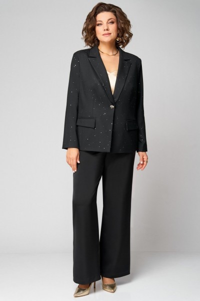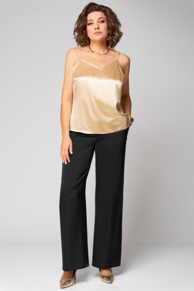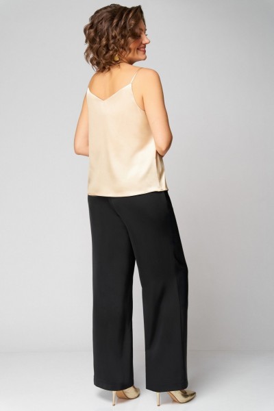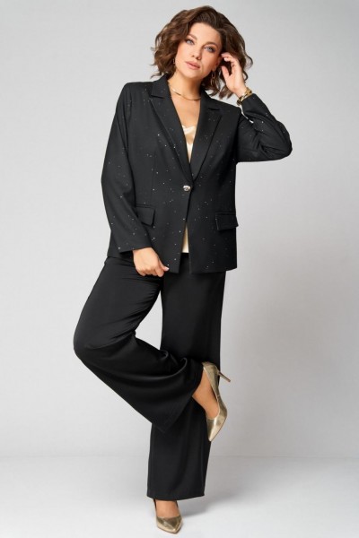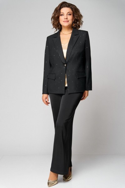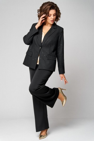 Стильный, женский двухпредметный комплект, жакет и брюки. Жакет выполнен из поли вискозной ткани в расшитые пайетки, частично на подкладке по переду. Воротник отложной с лацканами. По переду прорезные карманы в раму с клапаном. Застежка однобортная на 1 пуговицу и петлю. Длина жакета по спинке - 65см. Спинка со средним швом и талевыми вытачками. Рукав втачной, двухшовный. Длина рукава – 60 см. Брюки прямые из сатина. Длина брюк по боковому шву без пояса – 103 см. Брюки на поясе, по бокам резинка и косые карманы.Топ на бретелях с V-образным вырезом по переду и спинке. По переду застрочены нагрудные вытачки. Длина топа по спинке – 42 см