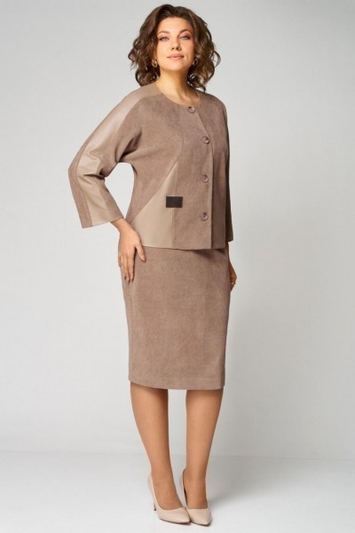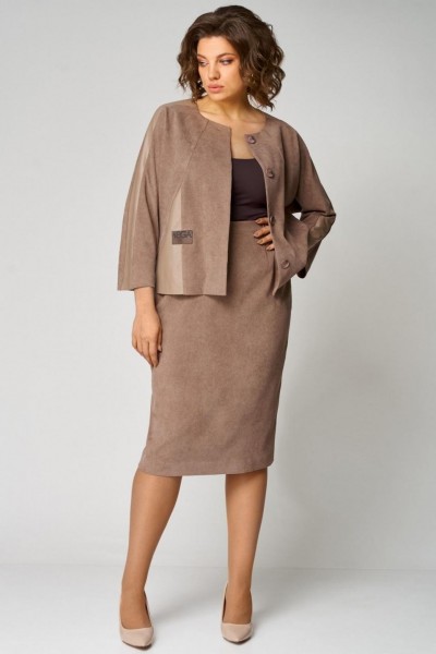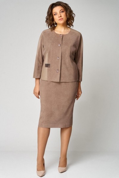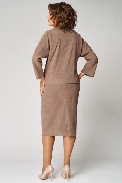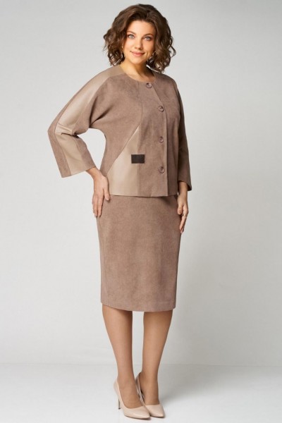"Костюм состоит из жакета и юбки. Жакет полуприлегающего силуэта, с цельнокроеным рукавом длиной 7/8. От плеча до низа рукава отделочная вставка из эко-кожи. По переду- фигурные наклонные рельефы. По правой стороне вставка из эко-кожи, настрочена нашивка контрастного цвета. Застёжка центрально-бортовая на 4 петли и 4 пуговицы. Юбка прямая, слегка зауженная к низу, на притачном поясе, по бокам с резинкой. Застёжка на 1 петлю и 1 пуговицу, и потайную молнию сзади в среднем шве, по низу шва разрез. Юбка на подкладке.