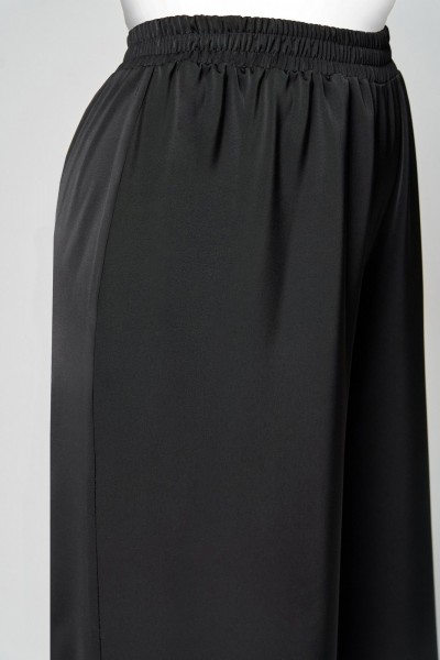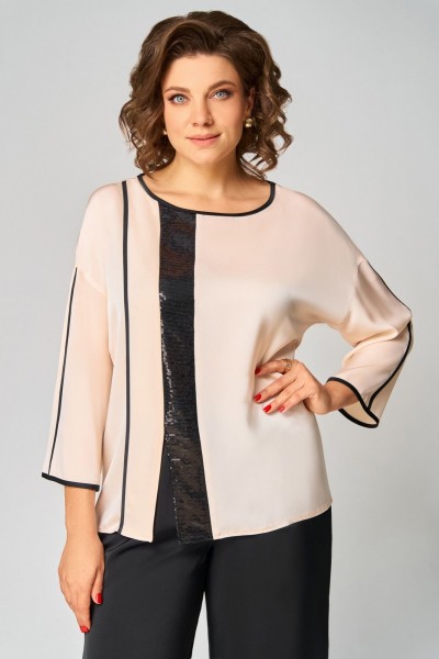 Комплект женский , двухпредметный состоящий из: туники и брюки. Туника прямого силуэта , со спущенной линией плеча . Округлый вырез горловины, обработан бейкой черного цвета. По переду с правой стороны отрезной рельеф , обработан бейкой черного цвета и вставка из пайеток. По переду имеется небольшой разрез. Спинка со средним швом. Рукав одношовный, центр рукава и по низу обработан бейка черного цвета. Длина рукава от горловины – 59см, длина по спинке -63см.Брюки прямые, пояс на эластичной резнике, по боковому шву лампас из пайеток. Длина брюк по боковому шву - 102 см.