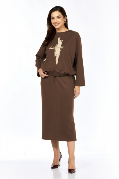 Костюм женский, состоящий из джемпера и юбки, выполнен в спортивном стиле из трикотажа. Джемпер свободного силуэта, по низу переда присборен на широкую манжету на резинке. Спинка прямая, удлинена на 4 см, рукав реглан, перед джемпера оформлен печатью, горловина круглая, оформлена бейкой. Юбка, прямого силуэта с поясом на резинке и разрезом сбоку, пояс оформлен декоративным шнуром с наконечниками, в боковых швах - карманы. Костюм подходит для прогулок на свежем воздухе, активного отдыха и повседневной носки.