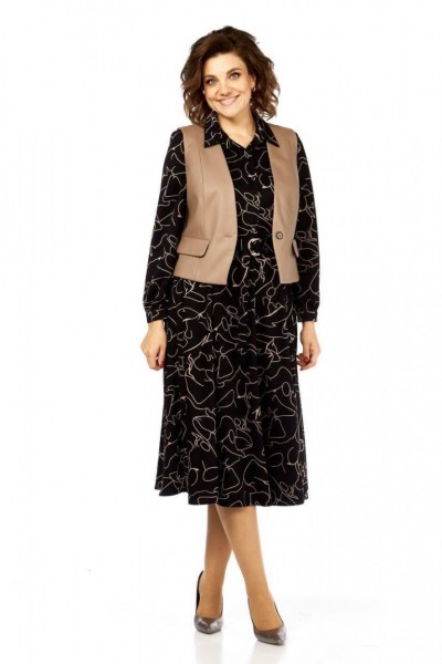 Состав ткани: Платье: вискоза - 60%, полиэстер - 35%, спандекс - 5%. Жилет: полиэстер - 65%, хлопок - 35%.