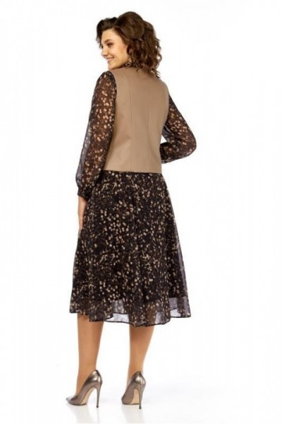 Комплект женский, состоящий из платья и жилета. Платье свободного силуэта, шифоновое, полностью на подкладке. Рукав втачной, снизу собран на манжету, манжета застегивается на петлю и пуговицу. По талии платье отрезное, спереди до талии планка на петли и пуговицы и нагрудные вытачки, которые позволяют создать идеальную посадку по груди. Юбка-шестиклинка. Дополнительно в комплекте к платью присутствует пояс из основной ткани. Жилет полуприлегающего силуэта из эко-кожи, с накладными декоративными клапанами, застежка на одну петлю и пуговицу.