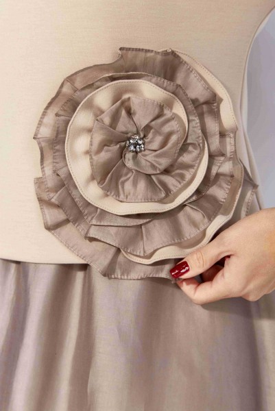 Комплект женский, 2х предметный, состоящий из блузки и юбки. Блузка полуприлегающего силуэта с цельнокройным рукавом длинной 3/4. Выполнена из трикотажного полотна "ТЕНСЕЛ". Вырез горловины "лодочка" По низу блузки, слева, декоративный элемент из рюши, в сочетании двух видов ткани. По спинке средний шов. Юбка широкая к низу, из текстильной ткани "вуалька" На подкладке. Пояс притачной с резинкой по кругу.