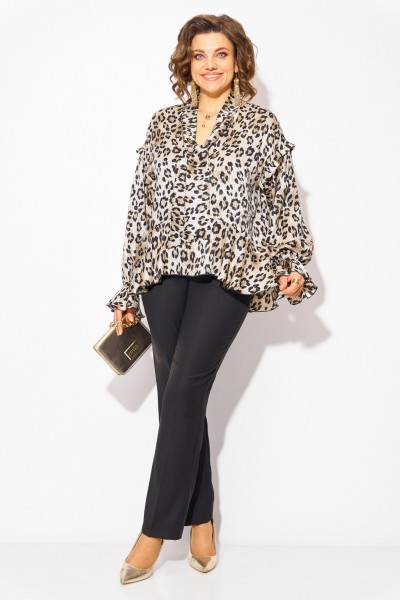 Леопардовая нарядная блузка в стиле «Оверсайз» – это модный предмет гардероба, который ассоциируется с уверенностью и энергией. Модель свободного силуэта трапеция, с ассиметричной линией низа. Линия горловины v-образная, переходит в мягкую стойку-бант. Рукав длинный на резинке, на спущенном плечевом поясе. Низ изделия и низ рукава оформлен мягким воланом. Спинка с небольшим v-образным вырезом. Брюки в комплекте прямого фасона, средней посадки. Пояс притачной, в боковых участках вставлена резинка. Застежка – брючная тесьма-молния с обработанным гульфиком. По переду заутюжены канты.