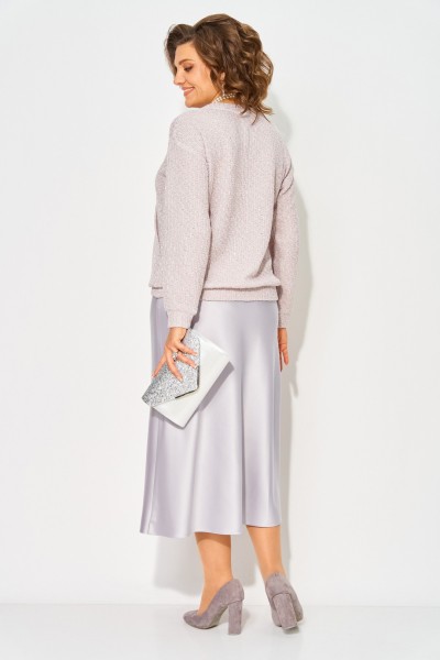 Эффектный праздничный комплект, состоящий из вязанного джемпера с ажуром и сатиновой юбки в жемчужно-лиловой расцветке. Мягкий и нежный материал этого джемпера делает его очень приятным на ощупь, теплым и уютным, а легкое мерцание придает свою изюминку. Горловина v-образной формы приковывает взгляды к линии декольте. Рукав длинный, на спущенной линии плеча. Низ рукава, а также низ изделия оформлен мягкой трикотажной манжетой.
