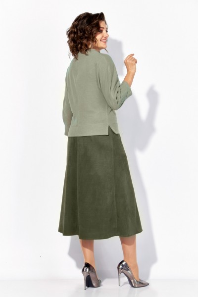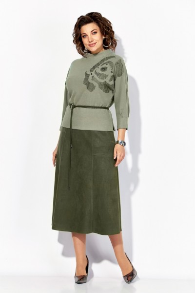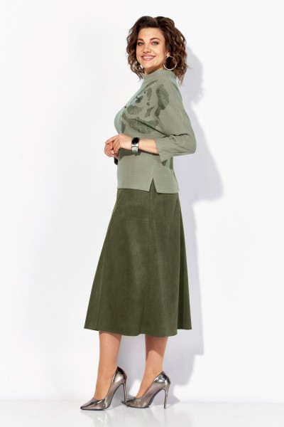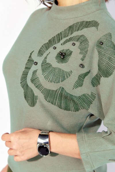 Блузка свободного силуэта, с цельнокроеным рукавом длиной ¾-ти, выполнена из мягкого трикотажа с бархотным эффектом. По низу рукава заложены небольшие складки. Модель на мягкой стойке-горловине с застежкой на потайную молнию по спинке. Лиф украшает ассиметричная печать-накат в виде цветка с бусинами. Широкая подгибка с боковыми разрезами обеспечивает идеальную посадку. Талию можно подчеркнуть съёмным поясом с металлической пряжкой. Юбка в комплекте выполнена из искусственной замши – спандекса, на подкладке. Перед с продольными рельефами на расклешение и боковыми карманами. Пояс в юбке притачной, в боковых участках вставлена резинка для комфортного прилегания. Застежка – юбочная тесьма-молния в среднем шве.